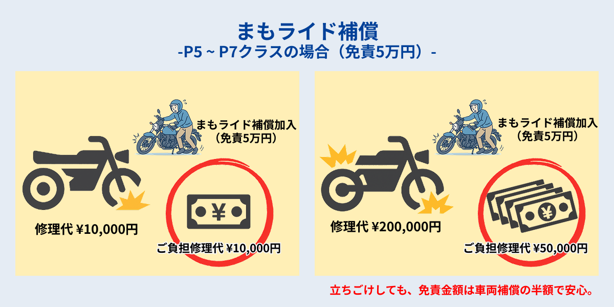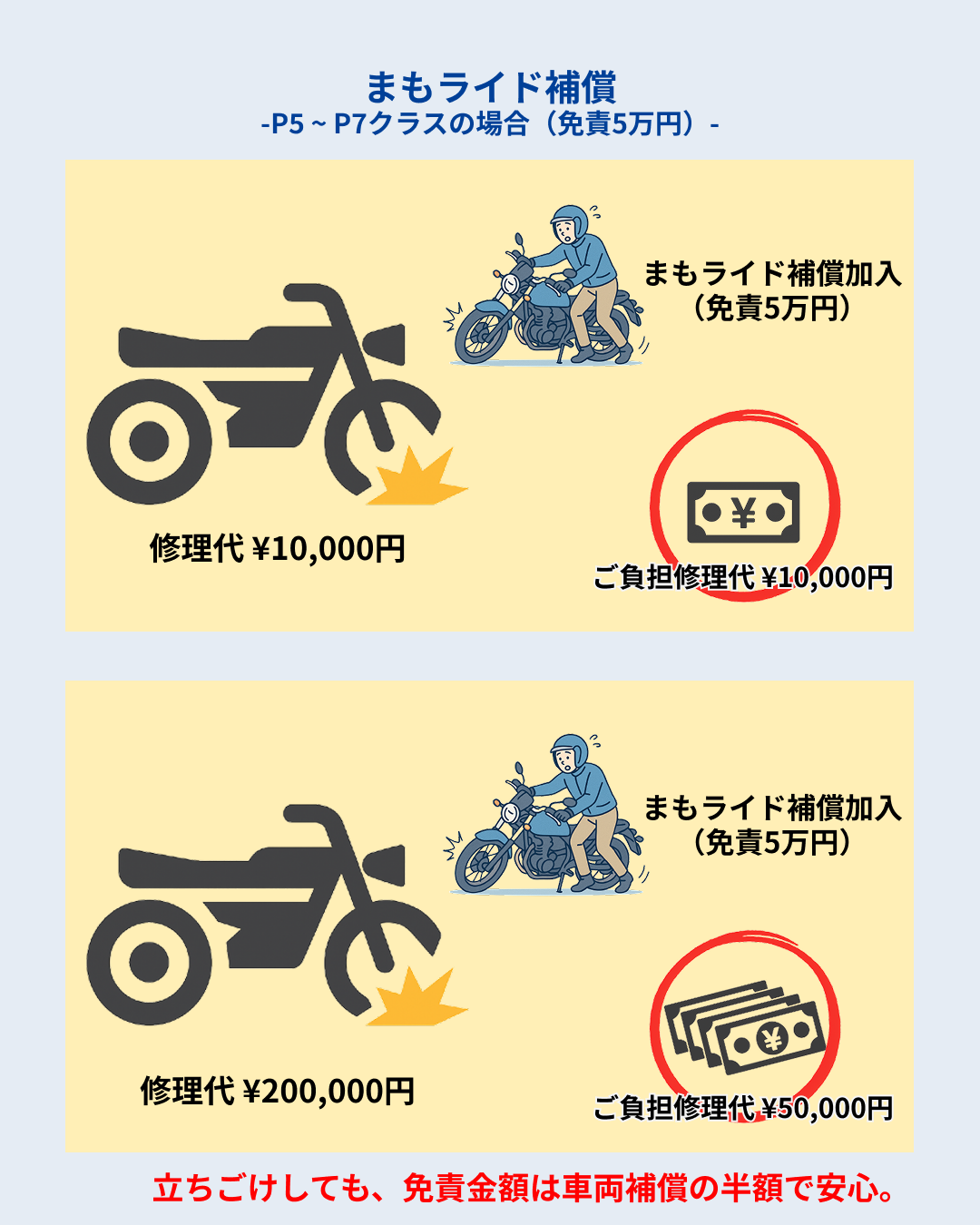 万が一の転倒や事故により、お客様が支払う修理費が発生した場合、免責金を超える金額が補償されます。