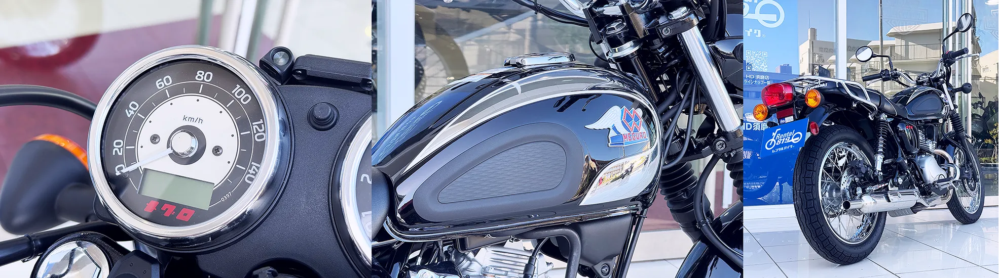 私個人の好みはW230よりメグロS1の方が好きです。メグロS1はメッキ部品も使用して。タンク等の仕上げも綺麗なバイクです。ネオクラシックスタイルのデザインで、ボディもコンパクトで、軽い気持ちでツーリングに出かけることができる。ホンダGB350Cよりボディがコンパクトなので、なるべき軽量なオートバイを希望する方には、メグロS1をお勧めします。リアキャリアとエンジンガードも装備しています。レンタル819西宮のレンタルバイクには、ドライブレコーダーを標準装備していますので、もしもの事故の際の証拠になります。是非一度メグロS1をレンタルしてみて下さい。ご予約お待ちしております。