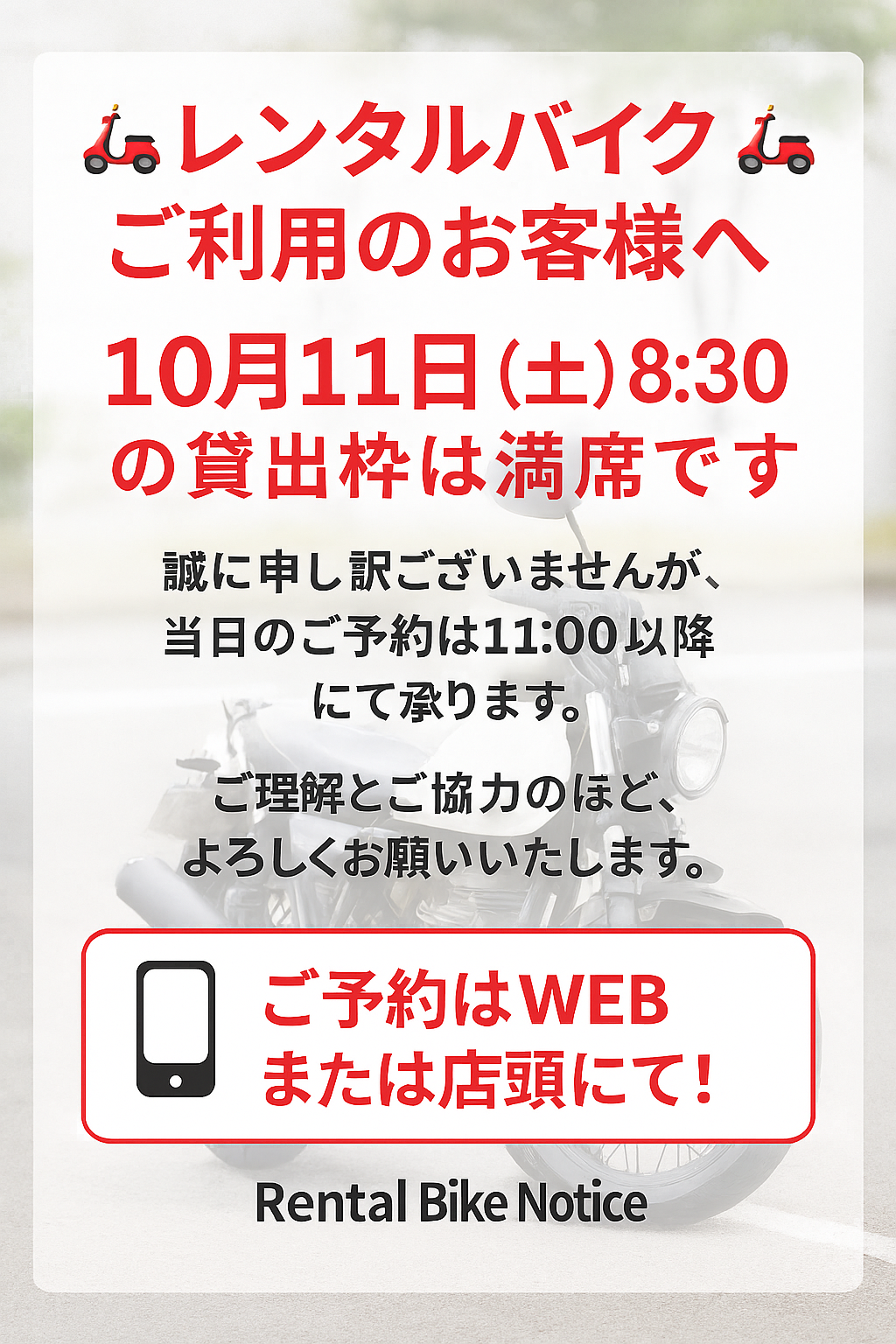 10月11日(土)8:30の貸出枠は満席です 誠に申し訳ございませんが、当日のご予約は 11:00以降 にて承りますのでご希望の場合は店舗にお電話ください。