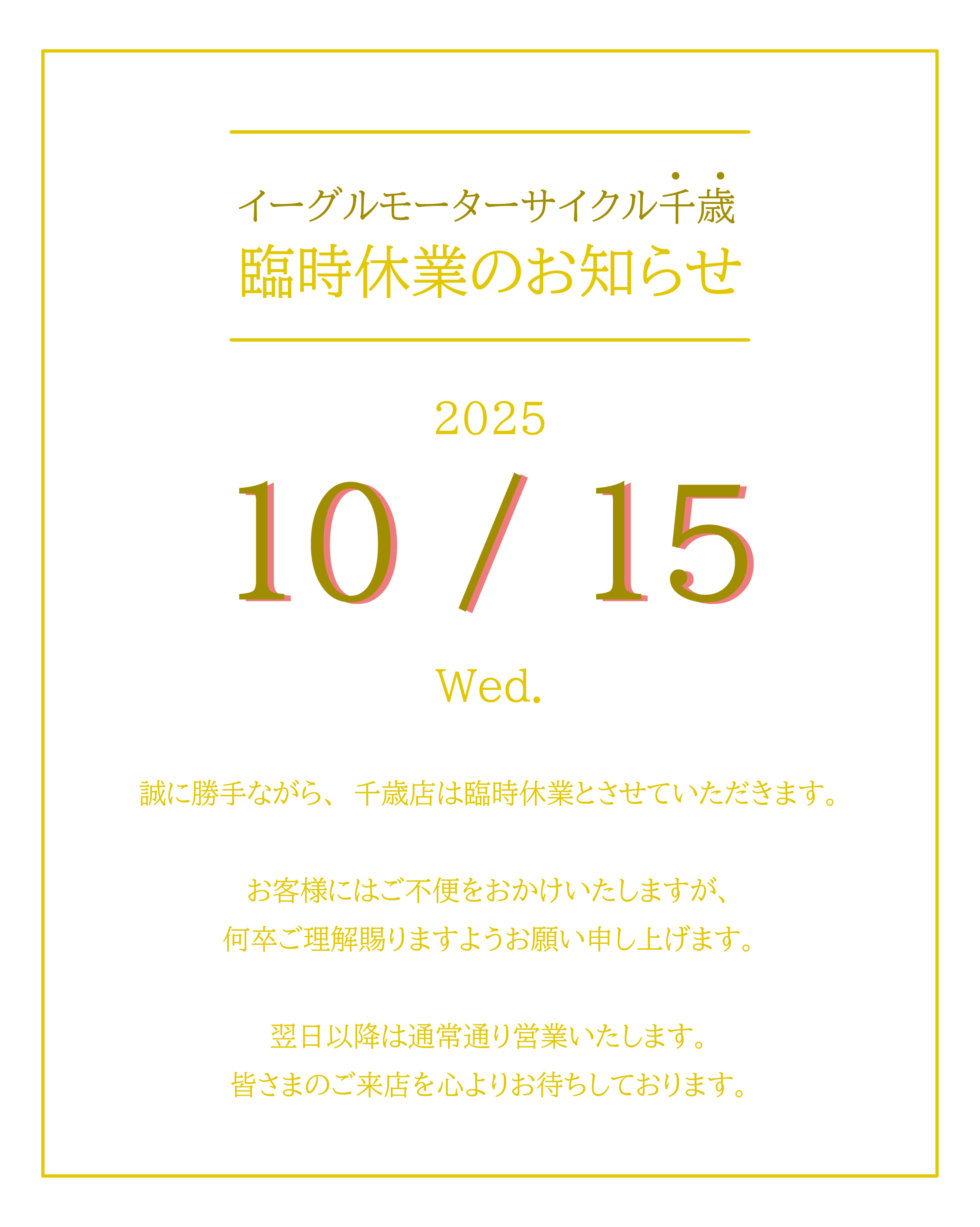 誠に勝手ながら、千歳店は臨時休業とさせていただきます。