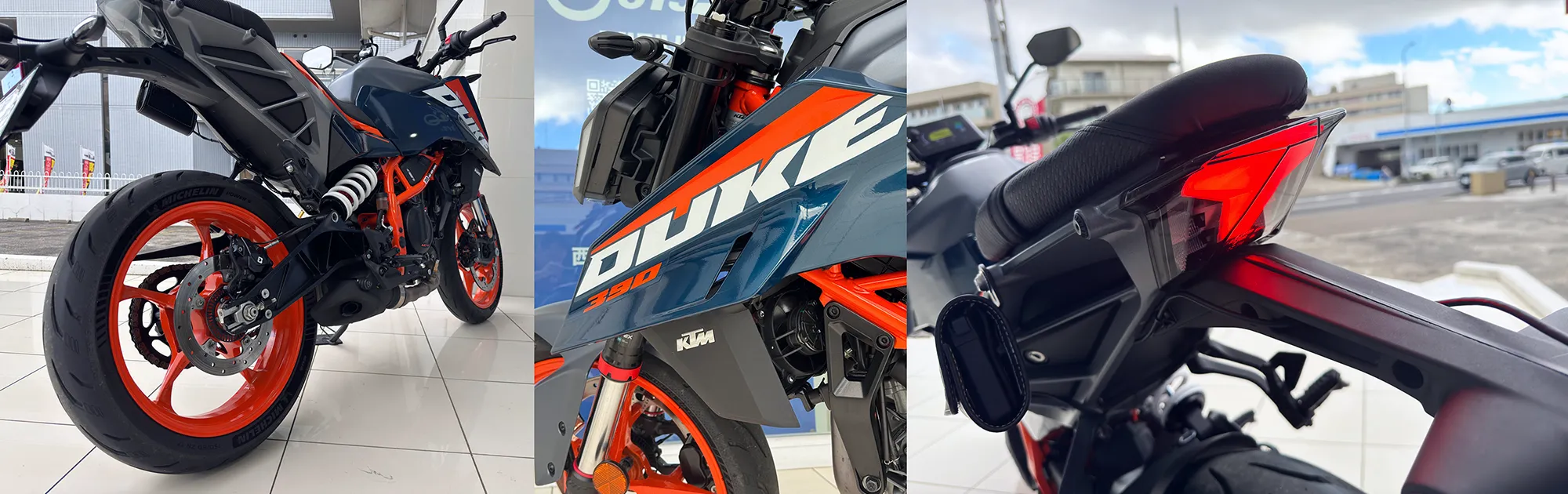 オーストリアのオートバイメーカーのKTMは、奇抜なカラーリングと独特なスタイルで人気があります。独特の形をしたヘッドライト、フロントフェラリングの形状は、すごくシャープでカッコ良いと思います。KTMのブランドカラーはオレンジで、レンタル819西宮ではオレンジのカラーリングではなくブルーの車両を選んでご用意していますが、一般的にKTMのオートバイのカラーリングは、オレンジ一色で派手なイメージがあります。テールライトの形状もすごくシャープで、全ての部分にエッジが効いている感じです。バイクの性能も良く、エンジンを高回転までまわして、走ると楽しめると思います。街中を走っているだけで、すぐにKTMに乗っているとわかるほどKTMは目立つこと間違いないです。まだKTMに乗ったことがない人は是非390 デュークに乗ってみて下さい。関西でもKTMをレンタルできる店は非常に少ないと思いますので、ご予約お待ちしております。