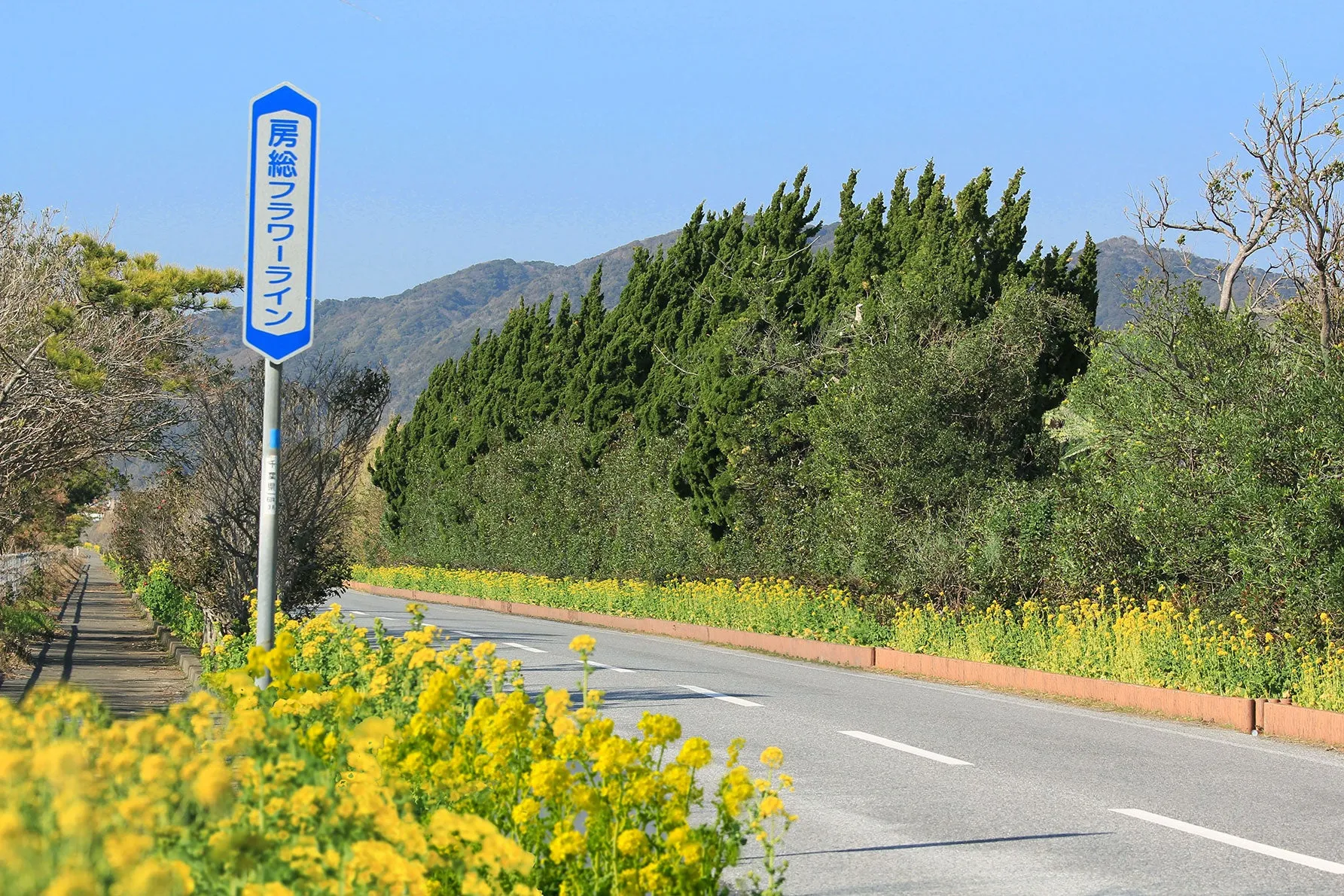 房総半島先端部の海岸沿いに走る道路沿いに花が植えられ、房総フラワーラインと呼ばれています。館山市から南房総市和田町までの約46km海岸沿いには、1月ごろから春にかけては菜の花をはじめポヒーなど、様々な春の花が咲き乱れています。おすすめルートは店舗を出発。昼食は海鮮または竹岡式ラーメンor 勝浦タンタンメン。午後はフラワーラインを走行し店舗へ戻ってくるルートです。