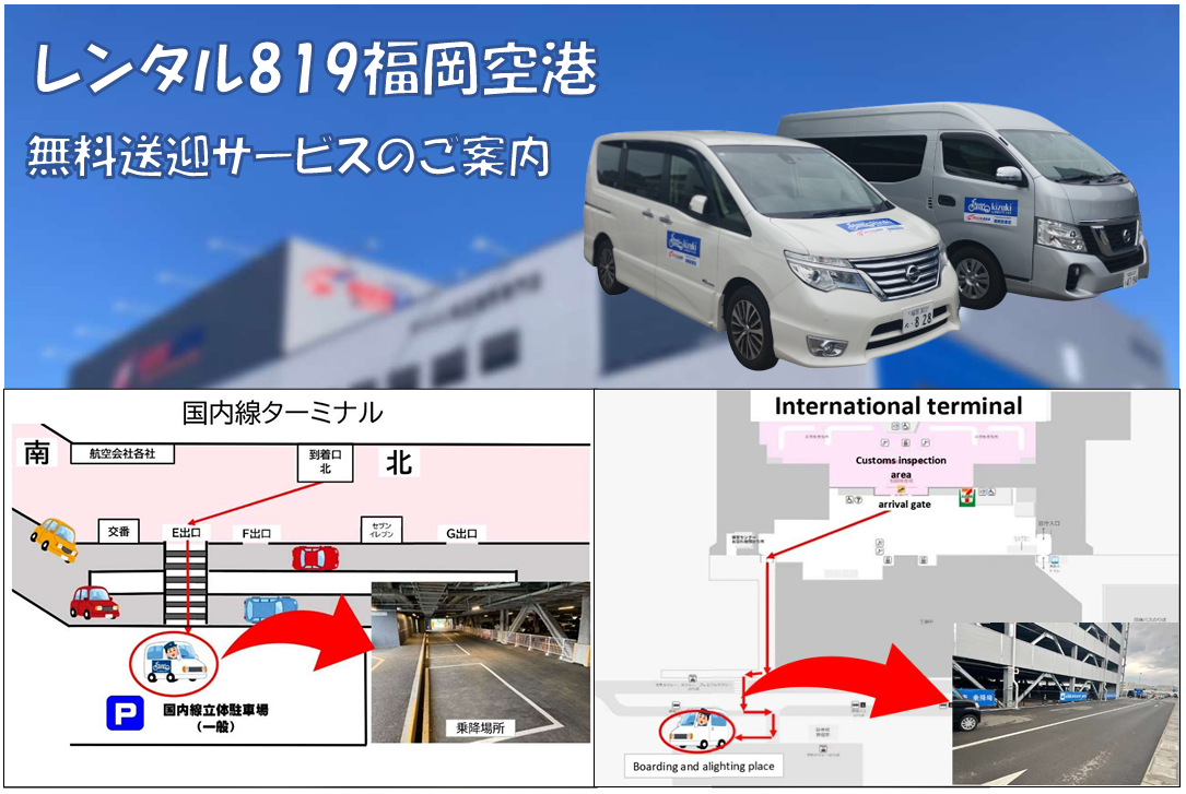 インフォメーション|無料送迎サービスのご案内 2025/02/25 店舗からのお知らせ 福岡空港店 レンタル819福岡空港では、レンタルご利用のお客様を対象に無料送迎サービスを実施しております。■運航区間:福岡空港⇋レンタル819福岡空港■運航時間:11:00-17:30 ※予約必須■予約方法:レンタル819福岡空港に電話でご予約 TEL:092-412-5819 (9:00-20:00)■乗降場所:画像にある乗降場所(画像の赤い丸)でお待ちください。【注意事項】※運行時間外の送迎は行っておりません。ご理解の程、よろしくお願いいたします。※ご予約の入っていない時間は運行しておりませんので必ず事前予約をお願いします。※事前にご予約を頂けない場合、ご希望に添えないことがあります。※なお、当日ご予約の時間に乗車できない場合は店舗電話番号までご連絡をお願い致します。※店舗から空港へお帰りの便もご予約が必要です。※国内・国際の乗車場所は時間制限がございます。乗車場所に到着しましたらご連絡ください。 お電話を受けてから店舗を出発いたします。 お迎えにかかる時間(国内:約20分 国際:約5分)「国内」線ターミナル乗降場所 -GoogleMap- (立体駐車場 1F )https://maps.app.goo.gl/JZFjrA6m35wzrAf58「国際」線ターミナル乗降場所 -GoogleMap- (航空写真がわかりやすいです。)https://maps.app.goo.gl/LtHuuBcjq5WkMaFE8■レンタル819福岡空港でのご予約、店舗詳細はこちら↓https://www.rental819.com/store/140 戻る