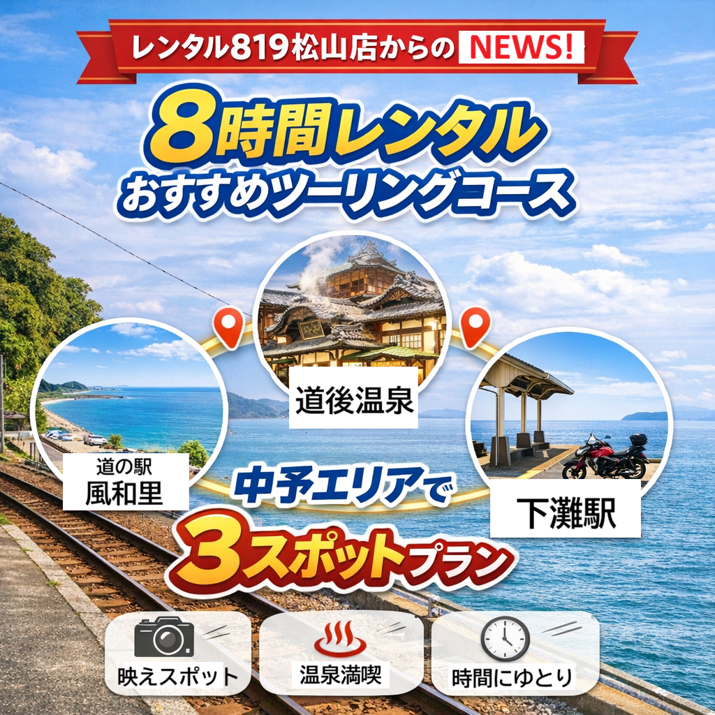 8時間利用の場合は 中予エリア内で「3スポット」のツーリング をおすすめしています🏍✨