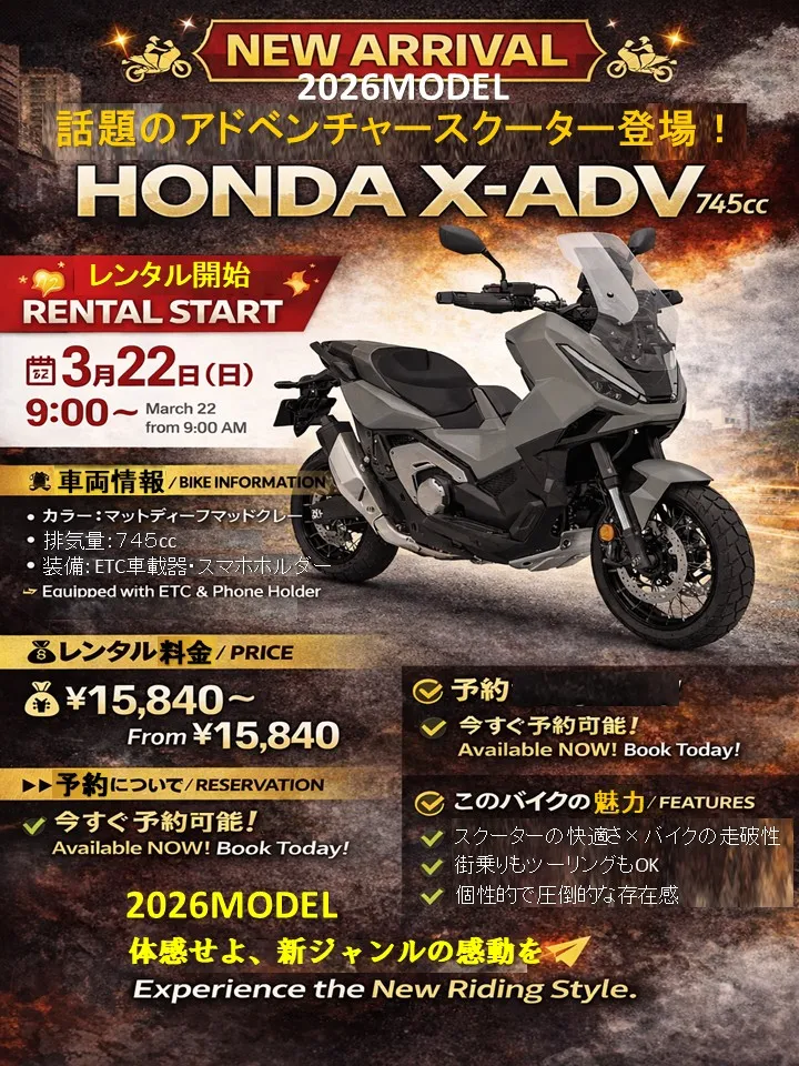新車種 HONDA X-ADV 3/22(日曜日)~ レンタル開始!