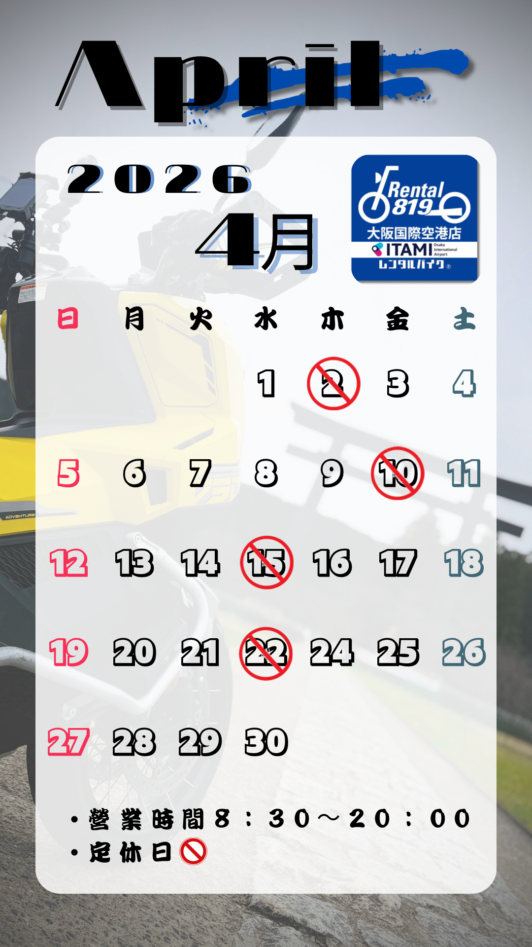 🛫🌸 【お知らせ】2026年4月の営業日・定休日についてカレンダーのご案内🌸🏍️🌸✈️ 🌸🌸[안내] 2026년 4월 영업일 및 비정기 휴무 안내